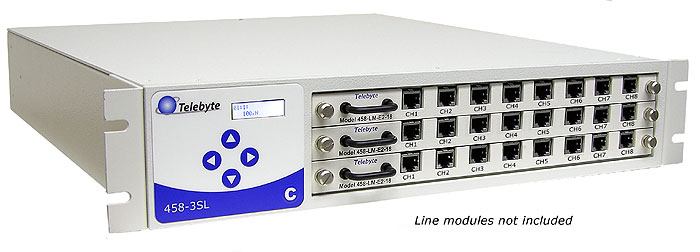 This compact, versatile unit accepts 1, 2 or 3 line modules or other products that use Telebyte's convenient line module form factor. At home in the lab or a high-volume production environment, it is capable of controlling from 1 - 24 channels and is ideal for testing DSL modems and other bandwidth-compliant telecom devices. While it can be used as a stand-alone unit, the built-in Control Module interfaces with a PC via RS-232, IEEE-488, or Ethernet. In addition, the 458 Universal GUI (included with purchase) may be used to control the unit from a PC. For added convenience, the Control Module firmware is field-upgradeable through the RS-232 port.