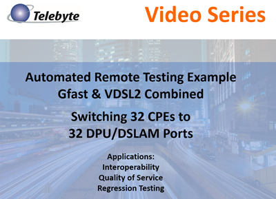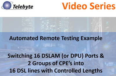 Remote Automated DSL Testing: Video Title: Telebyte Video Series Remote Automated DSL Testing 16-16x2 Length: 8m:28s Learn how to use Telebyte's switching products to configure remote automated testing using twisted pair cable. Provides an example of switching 16 DPU (or DSLAM) ports and 2 groups of 16 DPE's into 16 twisted pair lines. The lines lengths can be changed via remote commands. Ideal for rate vs. reach testing. Telebyte Products Featured: 600-SM-16-1-2-TP-100 Switching Matrix, CFA-24A Cable Farm Automation Switch. Video Title: Telebyte Video Series Automated Remote Testing for VDSL2 Vectoring Length: 6m:41s Learn how to use Telebyte's switching products to configure remote automated testing using twisted pair cable. Provides an example of switching 16 DPU (or DSLAM) ports and 2 groups of 16 DPE's into 16 twisted pair lines. The lines lengths can be changed via remote commands. Ideal for rate vs. reach testing. Telebyte Product Featured: 600-SM-8-1-4-TP-100 Switching Matrix. Video Title: Telebyte Video Series Automated Testing for Gfast & VDSL2 Combined Learn how to use Telebyte's 600 Series switching products to automate testing of 32 Gfast/VDSL2 CPE's and 32 DPU/DSLAM Ports over 1 loop. Suitable for interoperability, quality of service and regression testing. Telebyte Product Featured: 600-SM-1-1-32-TP-100 Switching Matrix. Length: 7m:20s |
